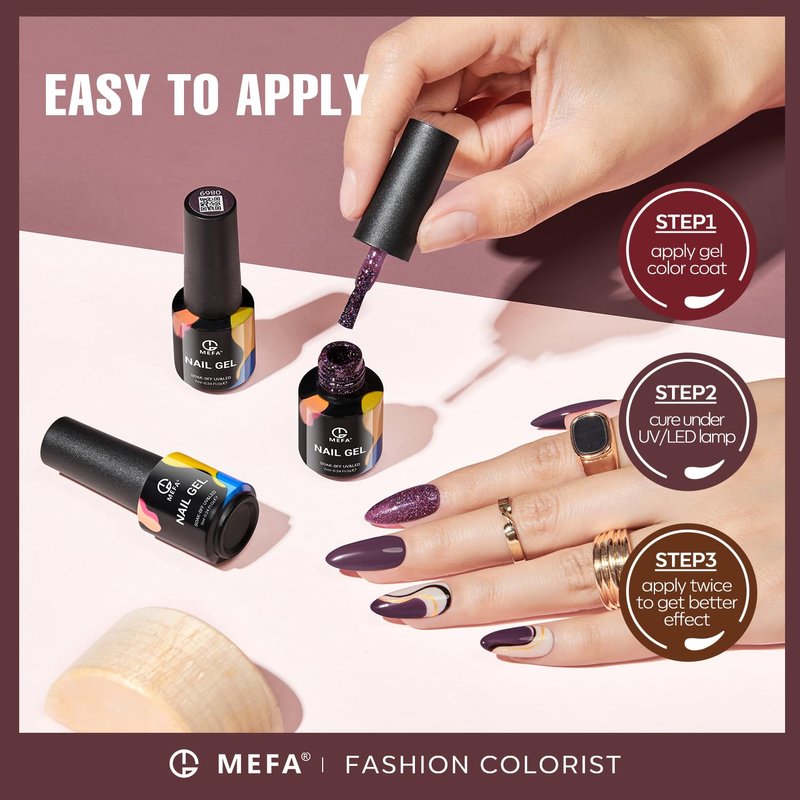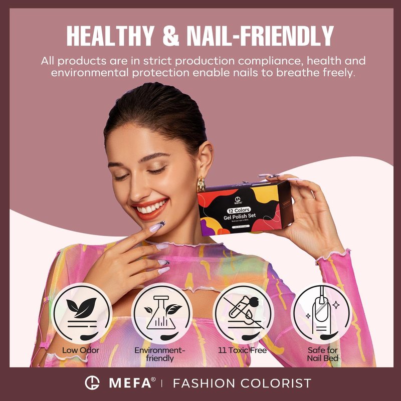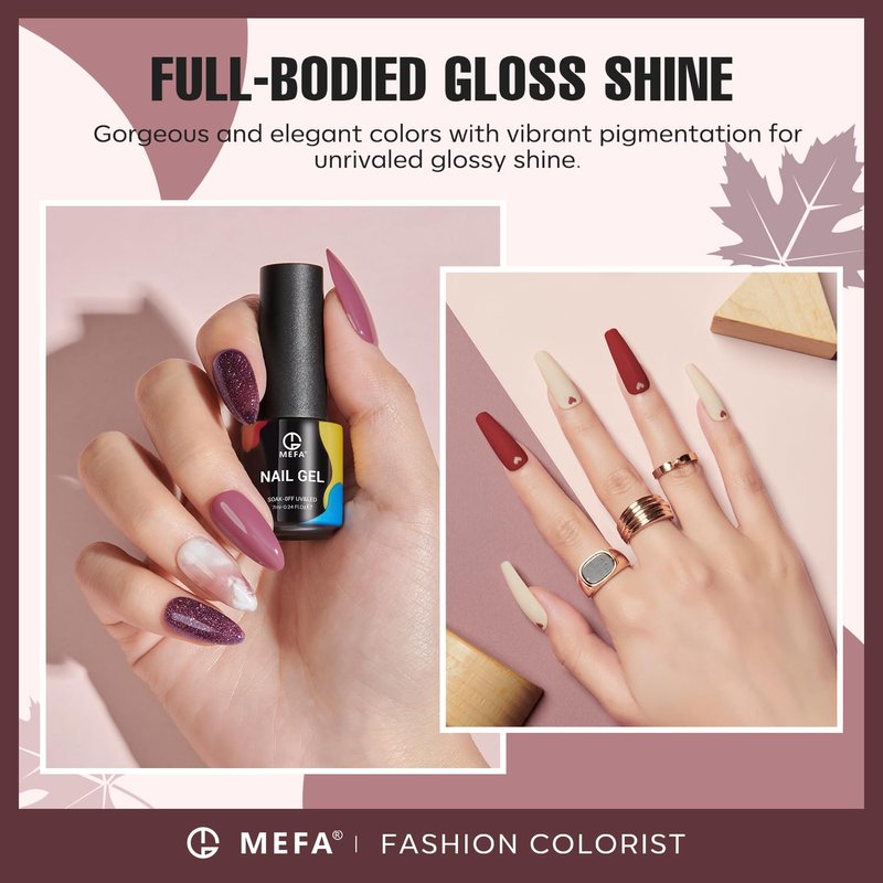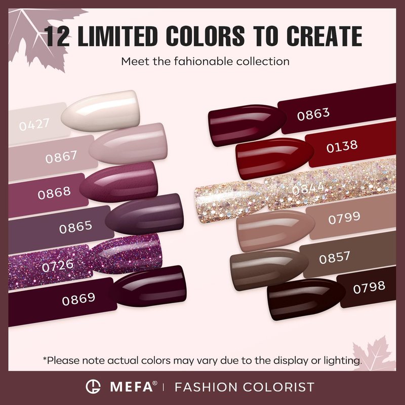 - 【12 Colors Gel Nail Polish】MEFA fall winter gel polish set offers a stunning range of 12 colors (7ml/bottle), including gel color shades like deep red, burgundy, shimmering purple, and champagne gold. This gel nail polish set are perfect for the autumn & winter seasons, following the latest 2023-2024 gel nail color trends. Whether you're into cozy purple or elegant nude, these shades are a must-have for your seasonal nail collection, suitable for any occasion.