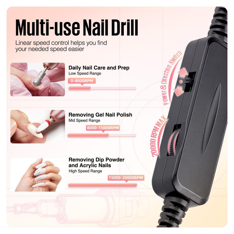 - Easy to Use, Even for Beginners: MEFA electric nail drill has adjustable speed and direction.The speed can be adjusted from 0-20,000RPM.It can also be controlled in the forward and reverse rotation squares.It is ergonomic and more comfortable to hold
