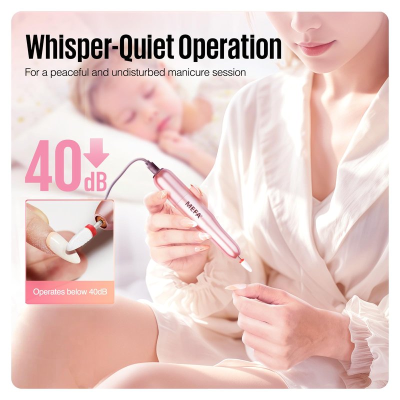 - Compact & Portable Design: The design of MEFA nail drill is relatively compact and portable. It weighs only 161g.The electric nail file is equipped with a standard USB port.Easily plug it into any USB socket, such as power bank, laptop, AC adapter