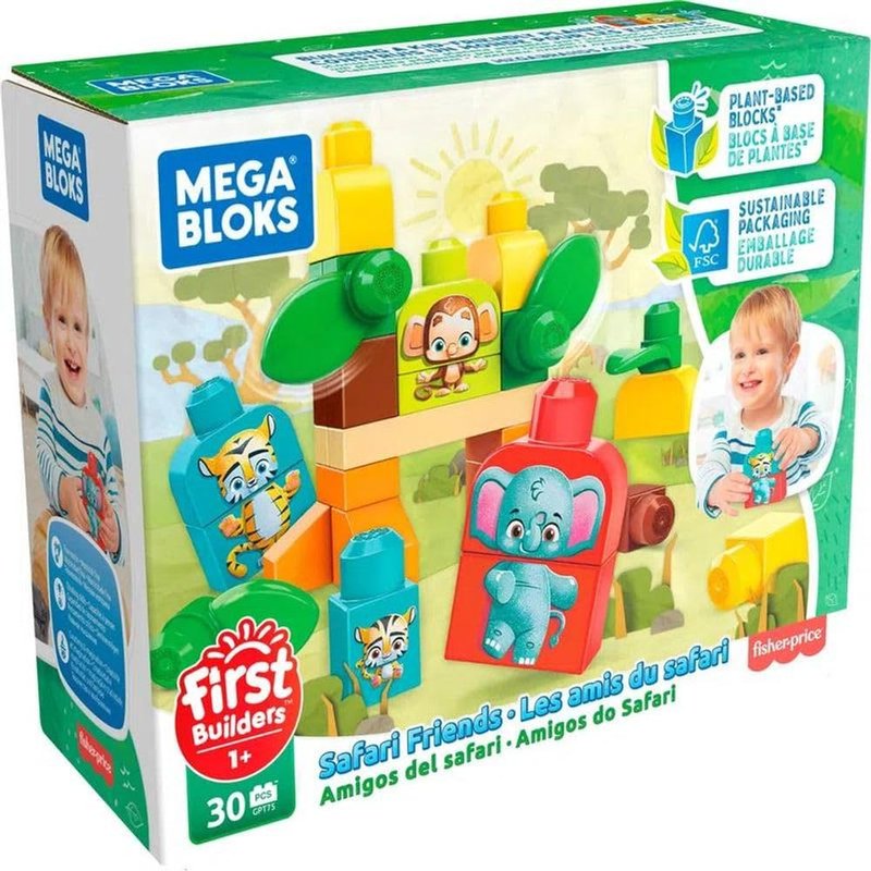 Mega Bloks First Builders Safari Friends with Big Building Blocks, Plant-Based Building Toys for Toddlers (30 Pieces)