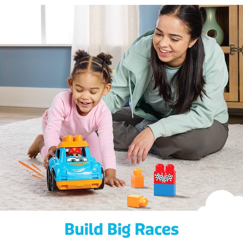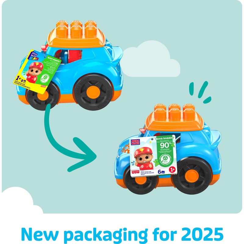 Mega BLOKS First Builders Toddler Building Blocks Toy Set, Ricky Race Car with 6 Pieces and Storage, 1 Figure, Blue, Ages 1+ Years