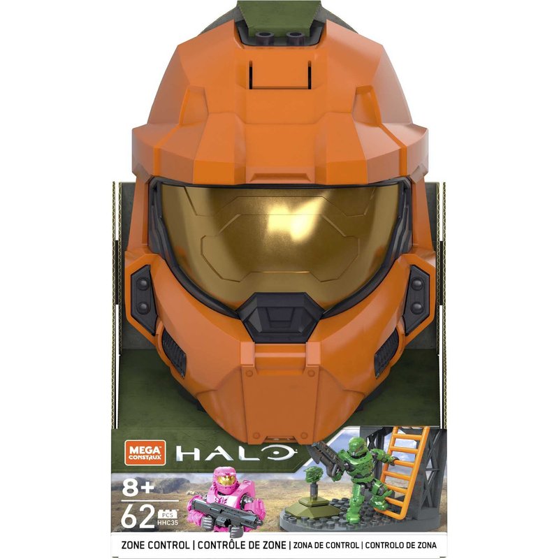 • Highly collectible orange Spartan helmet building set inspired by the Halo Strongholds multiplayer mode, with capture zone and super-micro Spartan helmet