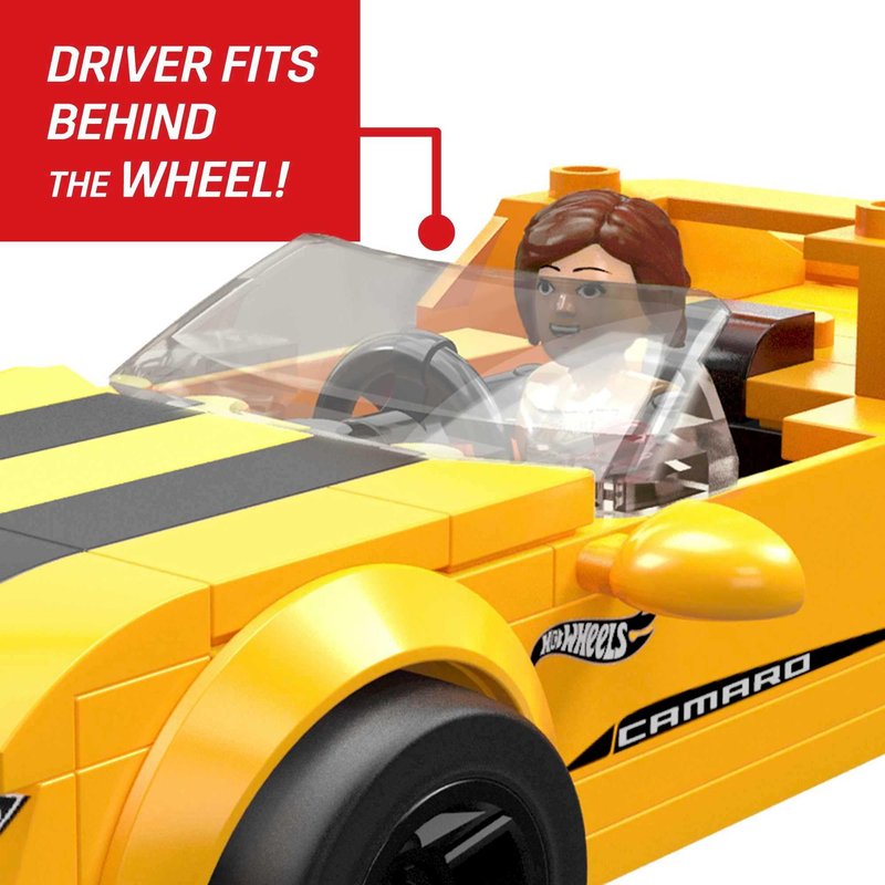 - 89-piece MEGA Hot Wheels '17 Camaro building toy with rolling wheels and driver's seat