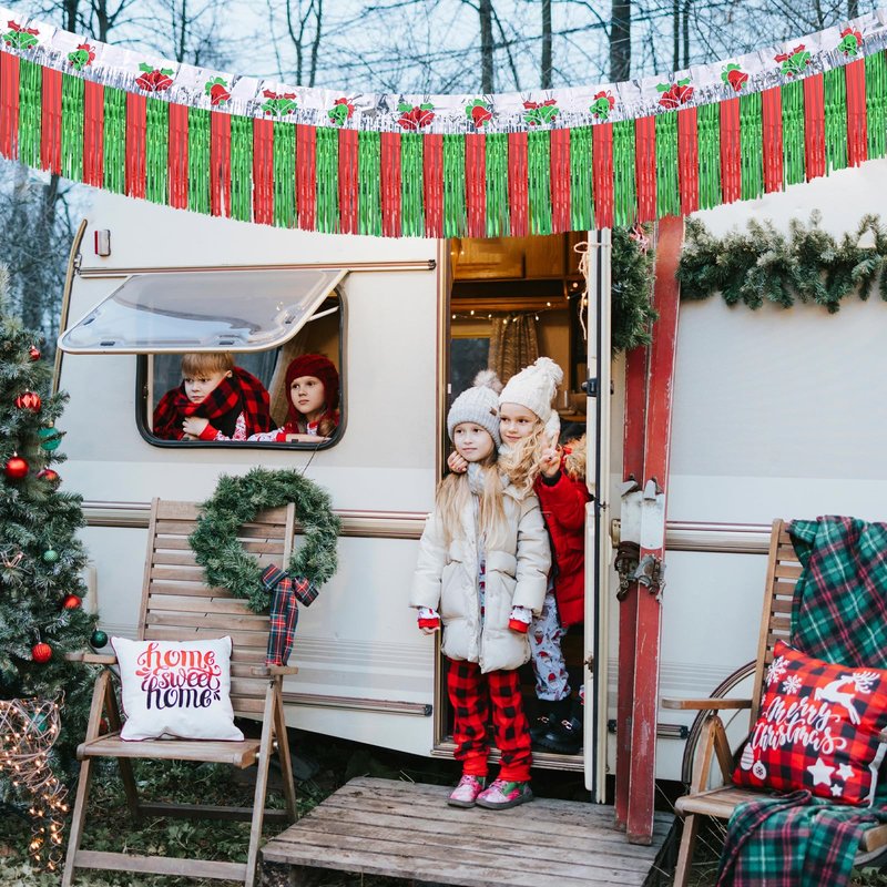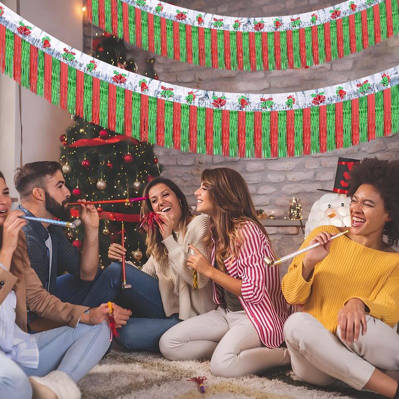Mega-L Christmas Decorations 2Packs 39Feet Foil Fringe Garland Tinsel Streamers, Red Sliver and Green Jingling Bell Metallic Hanging Backdrop Banner Table Skirts for Parade Floats Golf Cart Holiday