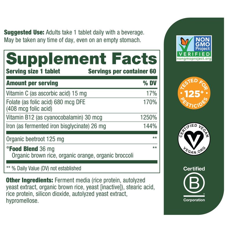 MegaFood Blood Builder - Iron Supplement Clinically Shown to Increase Iron Levels without Side Effects - Iron Supplement for Women with Vitamin C, Vitamin B12 and Folic Acid - Vegan - 60 Tabs