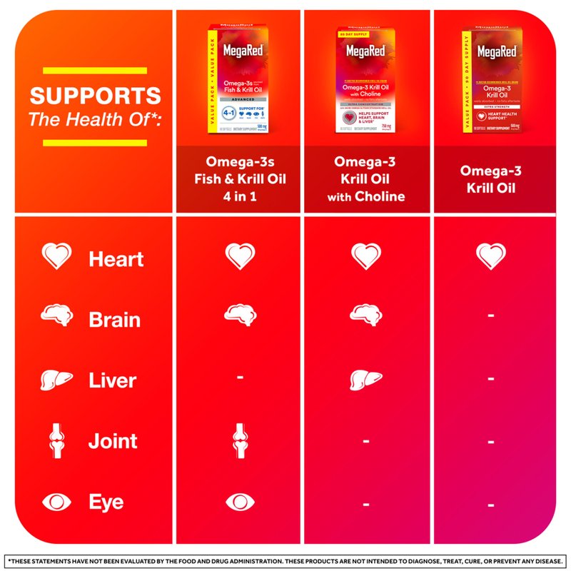- HEART HEALTH: MegaRed Omega 3 Krill Oil supplements provide an optimal combination of omega-3 fatty acids and the powerful antioxidant astaxanthin to support heart health in a once daily softgel.