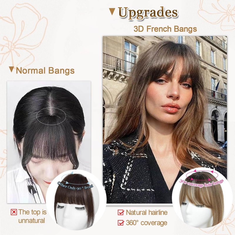 - 【Advantage】: 3D French bangs,360° coverage, compared to normal bangs, there are no obvious hair seams.By clip-in bangs, you can instantly achieve a fuller and more voluminous look while concealing topper thinning areas.