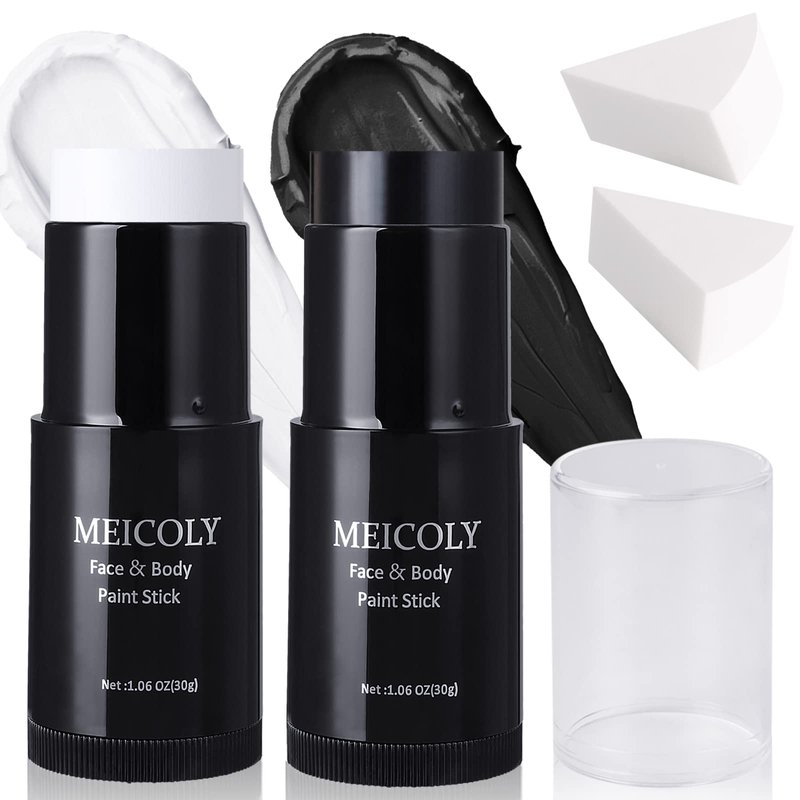 MEICOLY Black White Face Body Paint Stick Kit,1.06Oz Clown White Makeup Kit,2pcs Halloween Face Paint Grease Cream Mime Sticks,Joker Zombie Vampire Skeleton Cosplay with 2pcs Sponges
