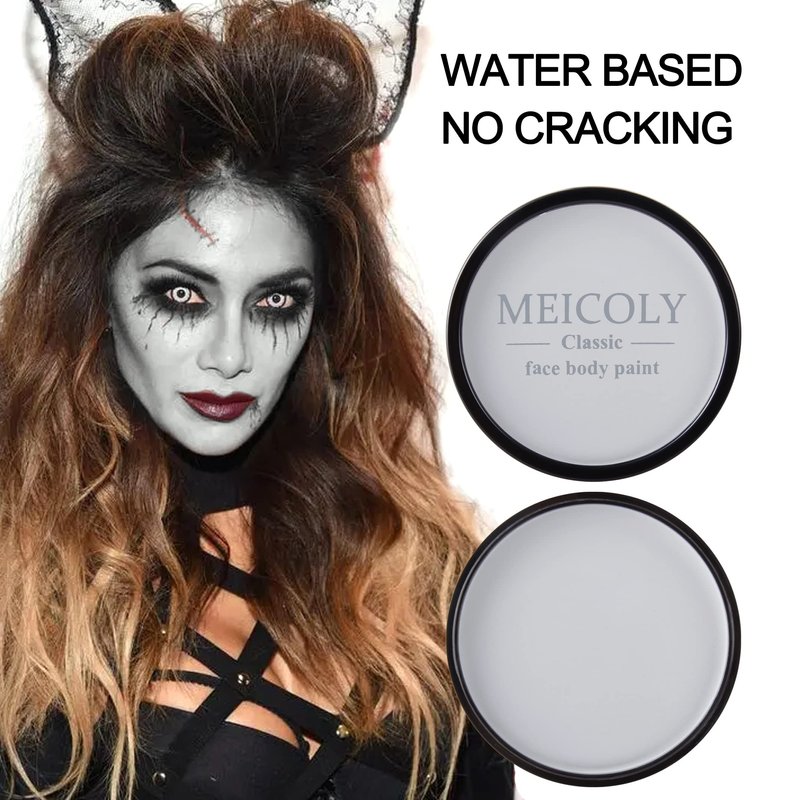 • ✔PROFESSIONAL GREY ZOMBIE MAKEUP FACE BODY PAINT --- MEICOLY light grey body paint is highly pigmented with full coverage, easy blending and layering.Transparent Setting Powder or Setting Spray is highly recommend to make it dry quickly and closed,not easy transferring.No fading or cracking,perfect for Halloween SFX gray zombie,Grayscale Homestuck Cosplay Makeup