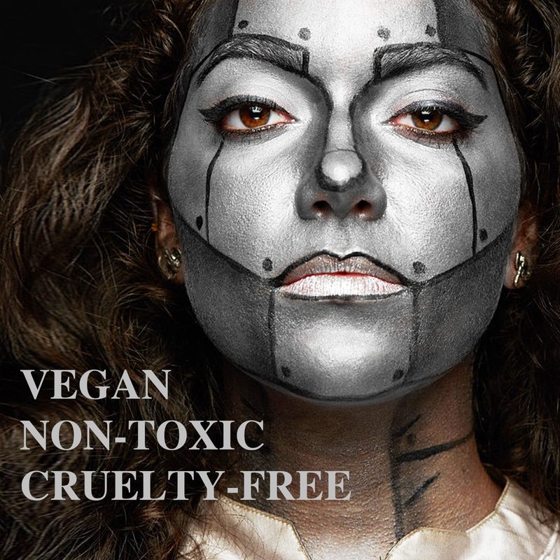 - Professional Halloween SFX Cosplay Makeup Face Paint --- 2.1Oz for our silver face paint,the highly pigmented formula meets your need for Halloween tin man cosplay makeup with full coverage.Infused with special formula,no fading and no cracking when wearing it.The nice consistency makes it blend into the skin easily with a brush, sponge or finger.