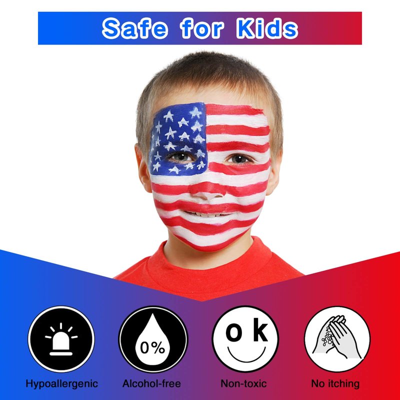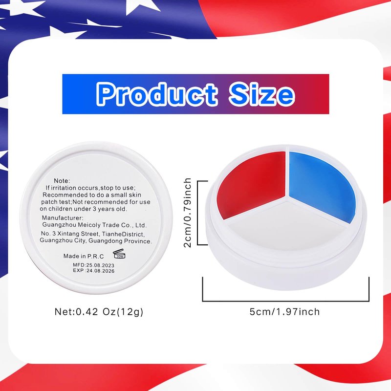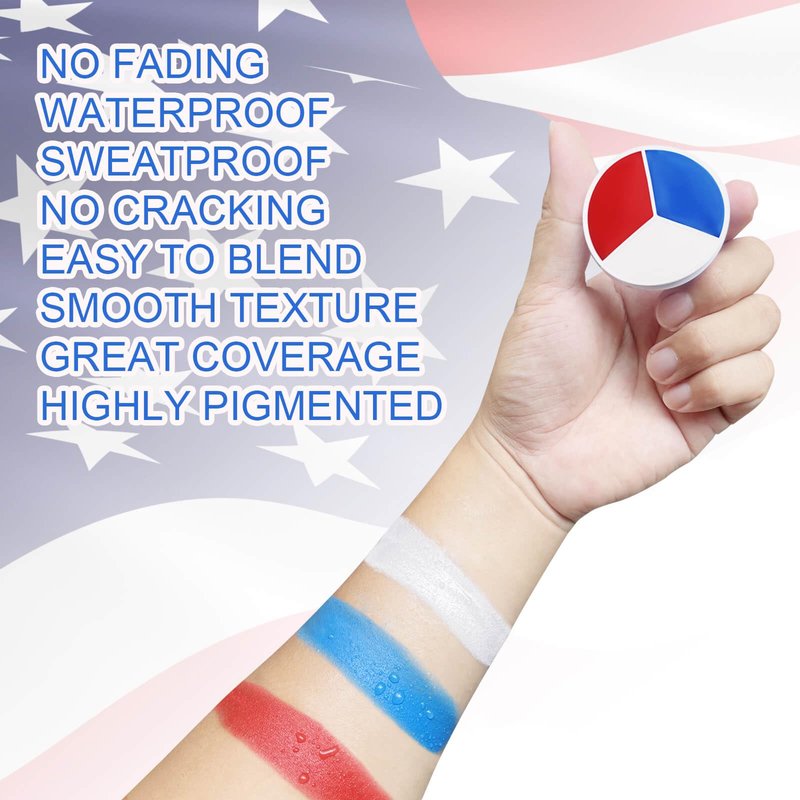 - USA Flag Pride Face Paint:MEICOLY fourth of july pride face paint palette includes red face paint,blue face paint and white face paint,meet your need to do usa flag makeup face painting,great Patriotic face paint for Memorial Day,school patriotic activities,International Competition,National Day,Parade,America's Patriotic Events 4th of July, Independence Day, Veterans Day or other more pride events