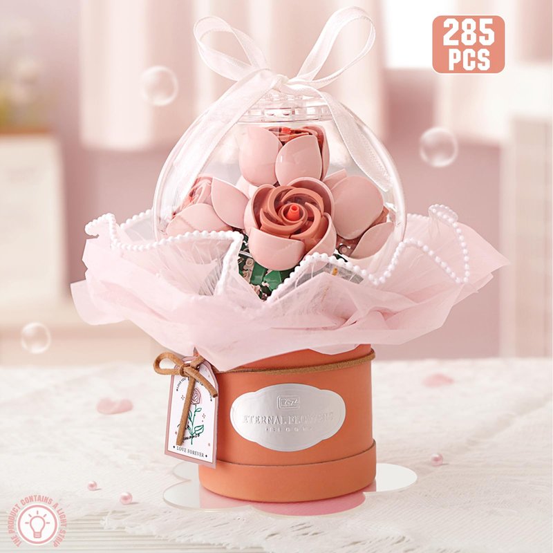 - Beautiful Bouquet for Valentine's Day:This bouquet of building blocks set includes artificial flowers, colorful gift gauze wrap, ribbons, paper box bases, light strips, and plastic covers. It has everything that a true bouquet needs.Light up the light strip(No battery), warm and romantic,add a festive atmosphere to you.