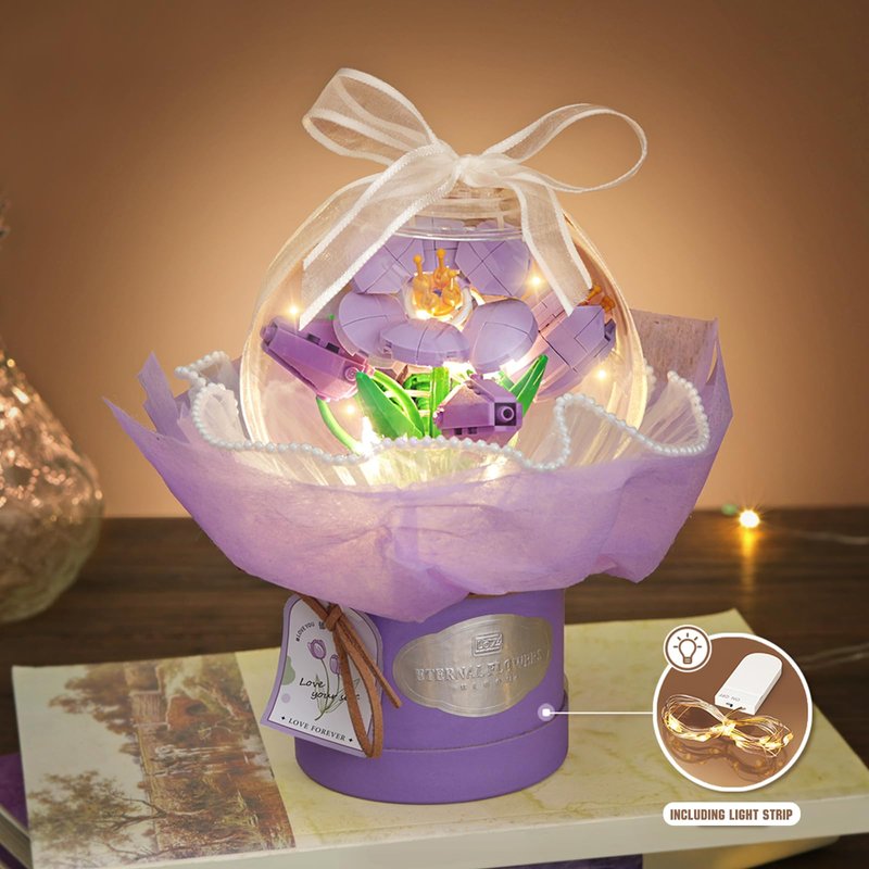 - Beautiful Bouquet for Valentine's Day:This bouquet of building blocks set includes artificial flowers, colorful gift gauze wrap, ribbons, paper box bases, light strips, and plastic covers. It has everything that a true bouquet needs.Light up the light strip(No battery), warm and romantic,add a festive atmosphere to you.