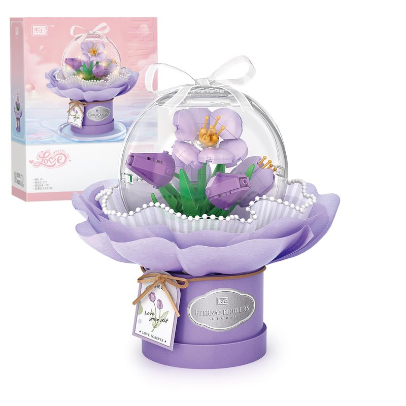 MEIEST Flower Building Blocks Set with Dust-Proof Dome,Simulation Bouquet for Valentine's Day,Bonsai Building Bricks Toys,Home Decor (Tulip)
