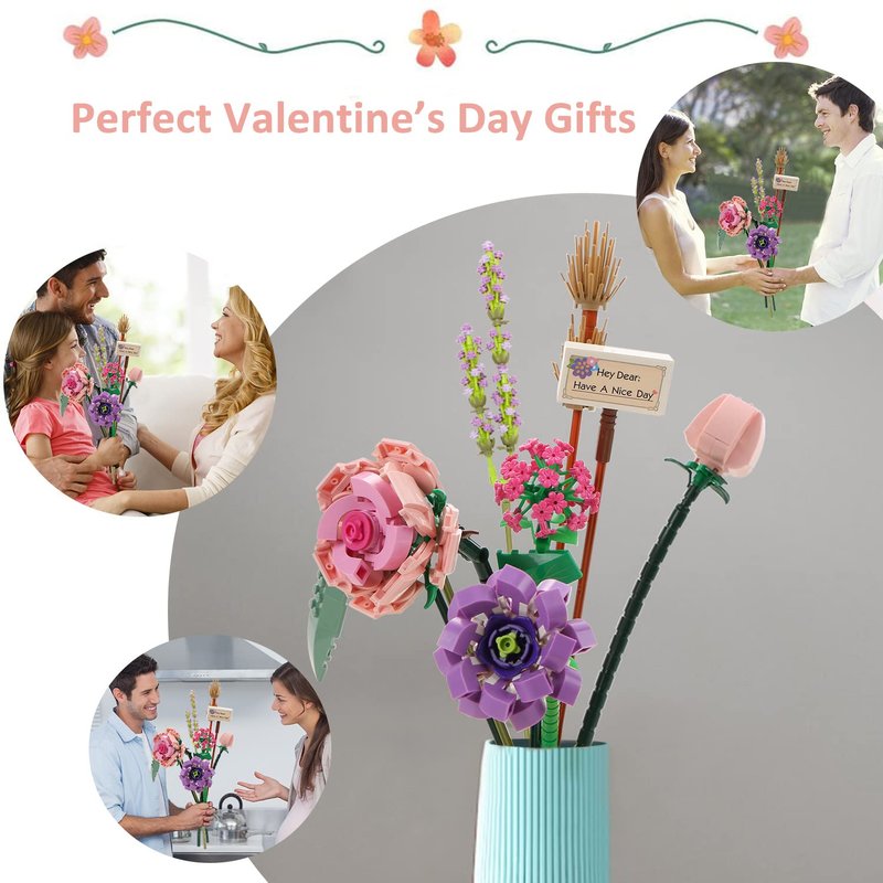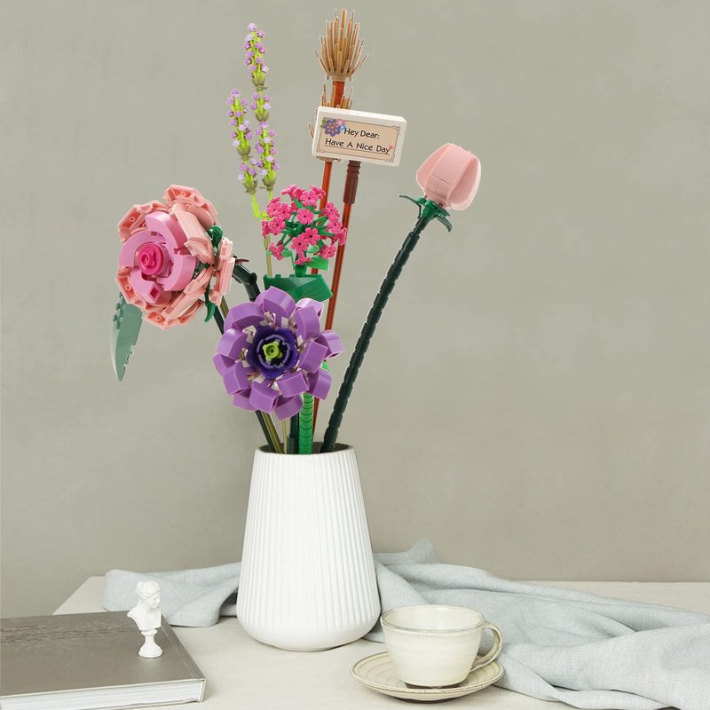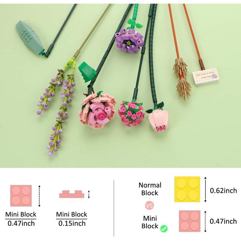 - Creative Decoration : Making the building kit set as a display for your office, book self, desk and room. Place the Artificial flower bouquet Model anywhere you like. Mini Bricks Model bricks Mode is mini size smaller than standard brick, but the detail are complete, rich in structure.