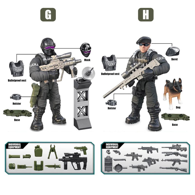 - SUPER VALUABLE PACK : This set contains 8 city special police construction action figures in different shapes, with a variety of Swat team prop accessories : weapons,guns,Outfits, firearms, holsters, cuffs, grenade, heavy body armor, ballistic shields, entry tools, advanced night vision optics, and surveillance equipment and many more.Imagine creating battles with minifigure decorations.