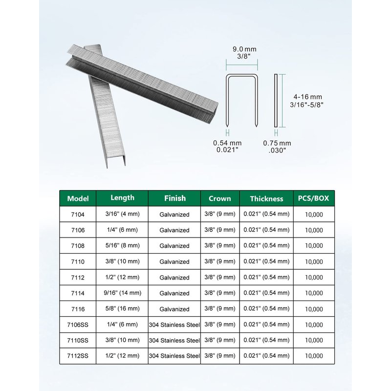 [About meite] Established in 1986, Guangdong Meite Mechanical Co. Ltd. is a leading company in professional pneumatic nailers & staplers, pneumatic tools, and accessories, etc. in China. Meite products are widely used in the furniture manufacturing industry, home furnishing industry, construction industry, packaging industry, home appliance industry, automobile industry, animal husbandry, etc. It is the original intention to obtain customer satisfaction with excellent product quality and performance. [Product Description] Gauge: 22 Gauge; Full Length: 3/8" (10 mm); Crown: 3/8" (9 mm); Quantity: 10,020 Counts per Box, 20 Boxes per Case/Carton; Finishing: Stainless Steel (with Sharp Chisel Point); Compatible Tools: meite MT7116, MT7116S, MT7116LN, 7116B, 7116BL pneumatic staples and other brands of 22 gauge fine wire stapler with the same fastener range; Galvanized straight brad nails have a smooth surface, can be easily concealed if desired, and are durable for interior uses. Available from lengths of 3/16"-5/8" (4-16 mm) providing flexibility for different types of projects. [Application] Widely used in construction, home repair projects, window treatments, furniture trim, automotive vinyl and trim, picture frames, bedding, furniture frames, and molding. [Sharp Chisel Point] Designed to drive the staples into objects with fewer jams, buckles, and interruptions. Easily and quickly penetrate through many different materials with no deformation.