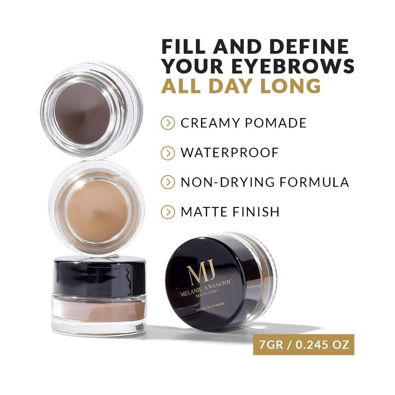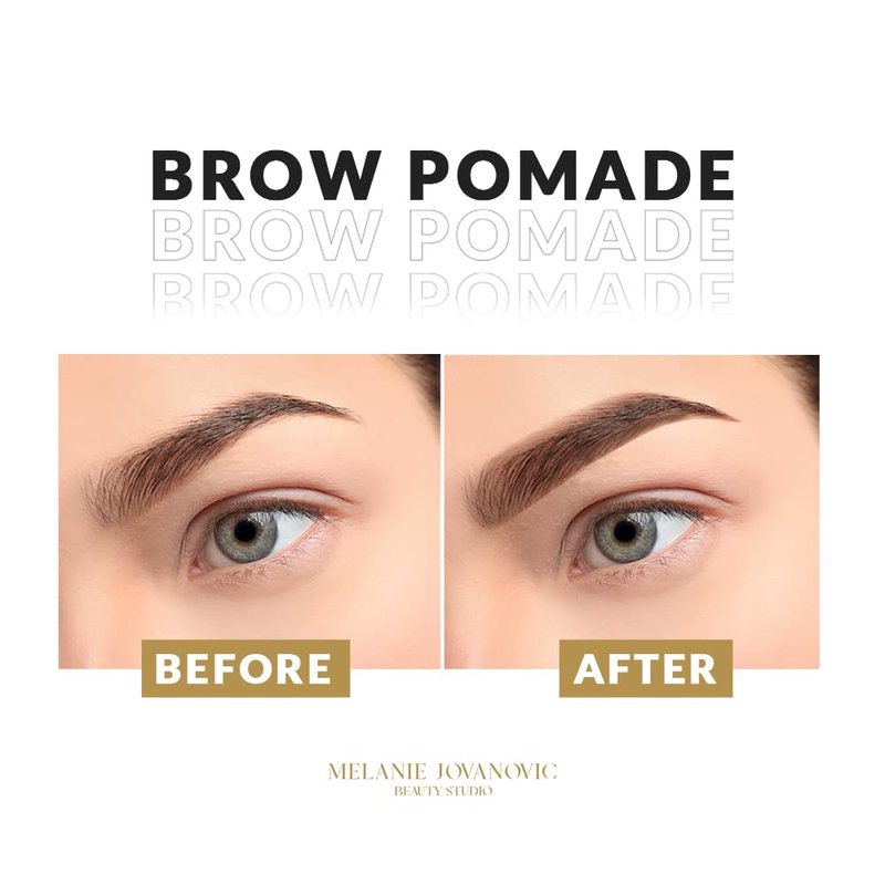 Melanie Jovanovic Beauty Studio Brow Pomade is a highly pigmented and creamy formula ideal for defining perfect eyebrows. With the help of the angled and spoolie brush you can outline, fill in and define your eyebrows in just a few minutes. The Brow Pomade is very easy to apply and has a long-lasting and buildable formula that glides on smoothly to skin and hair, allowing time for blending before drying down completely to a matte finish that will last up to 18 hours. Smoodgeproof and waterproof formula, allows time for blending before it sets and with a minimal amount of Brow Pomade that goes a long way. The product will yield for very many applications and you will love its professional finish. How to use it: Using the spoolie end, comb brow hairs upward, then outline the lower arch of the brow using the product on the brush end. Blend the eyebrow color with the spoolie. Next, brush brow hairs downward, outline the upper arch of the brow and lightly blend with the spoolie. For the most natural-looking results, continue to blend the product through the brow during the application process. Finish by filling in the front of the eyebrow with the remaining product to create a soft gradient effect. This innovative mela beauty studio product comes in three shades so you can find your perfect match, or even combine two of them for stunning definition. Be sure to close the lid tightly after each use to preserve the creamy and smooth texture.