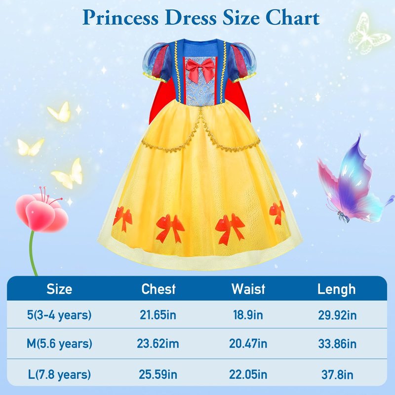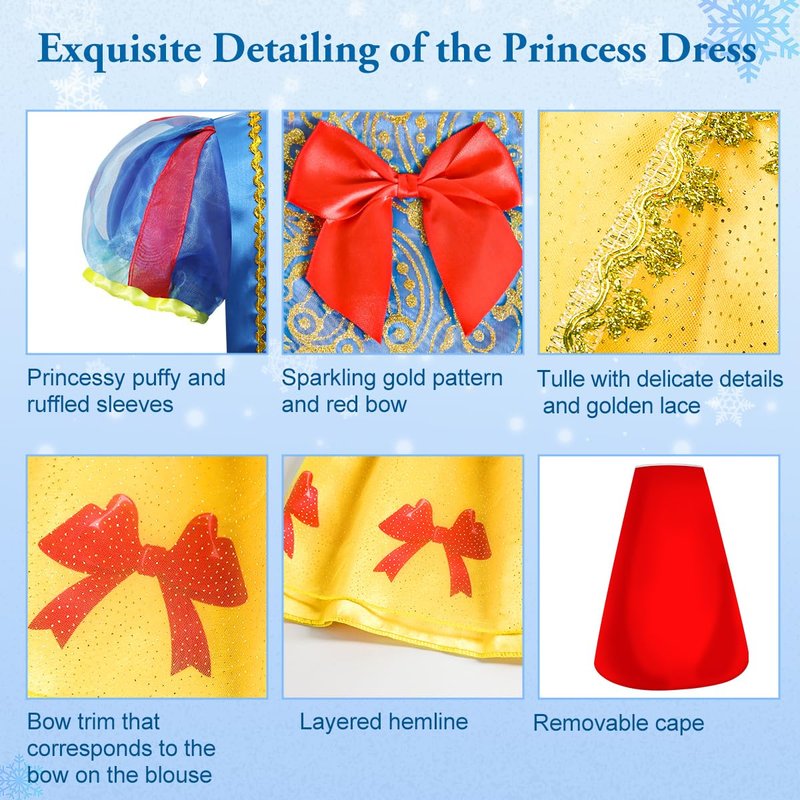 - Adorable Princess Dress Featuring Unique Cape and Coordinated Color with Elegant Golden Patterns for Better Princess Vibe. The girls princess dress is in fresh blue and yellow, red embellishment carefully used blue complementary colors, making the color scheme more coordinated. The cape and golden weave add extra highlights. Every detail is exquisitely designed to give the little girl real princess experience!
