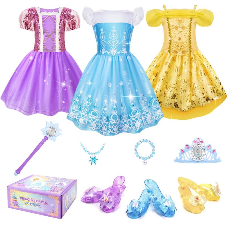 - Deluxe Princess Dress Up Trunk Ranging from Princess Dress, Shoes to Jewelry Boutique for Special Little Princesses. 3 tops and 3 skirts meet diverse princess themes - elegant purple dress, nifty yellow dress, and timeless blue dress, matching with 3 pairs of toddler-sized dress up shoes, crown, wand, necklace and bracelet. Let your girl play her favorite princess roles and leaving unforgettable childhood memories.