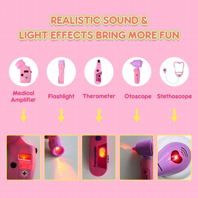 - A Chance to Experience Doctor and Nurse, Ease the Fear of Doctor Visit. This doctor toy set features enough medical tools for your girls pretend to play the role of doctor, nurse or patient, learn more about the healthy knowledge and ease anxieties about check-ups. It is good for familiarizing your little girls with any medical tools and “seeing a doctor”procedures to calm doctor-related fears.