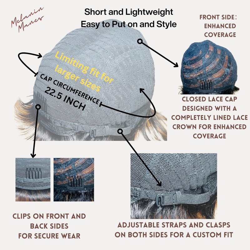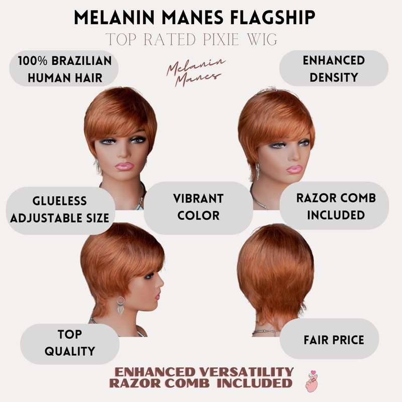 Brand name: Melanin Manes (Celebrate your melanin, embrace your power) < br>< br> Hair Quality: 100% Brazilian virgin human hair< br>< br> Hair Style: Pixie Cut< br>< br> Unit Weight: 90g< br>< br> Hair Density: 180% density< br>< br> Cap size: 22-22.5 inch medium cap size with adjustable straps< br>< br> Color: Jet Black (1B); Black with Auburn Highlights (1/30); Dark Brown with Strawberry Blonde Highlights (4/27); Burgundy (99J), Ginger Orange (350); Honey Blonde (30); Chocolate Brown (4) < br>< br> Accessories: Free Razor Comb and Free Wig Cap< br>< br>