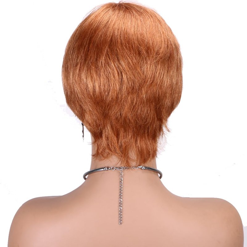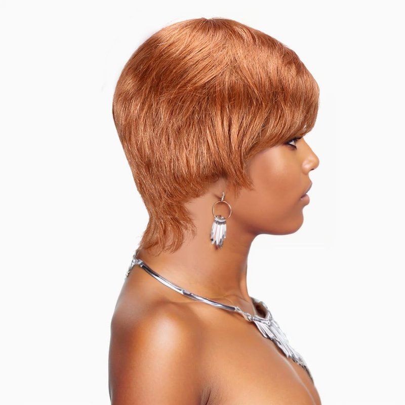 Melanin Manes Layered Pixie Cut Short Wig With Bangs Tapered Style 100% Brazilian Human Hair Honey Blonde 30 180% Density Glueless Machine Made With Razor Comb With Wig Cap Adjustable Cap