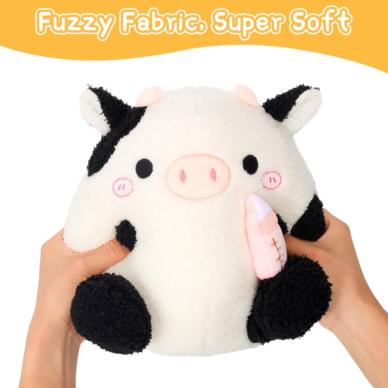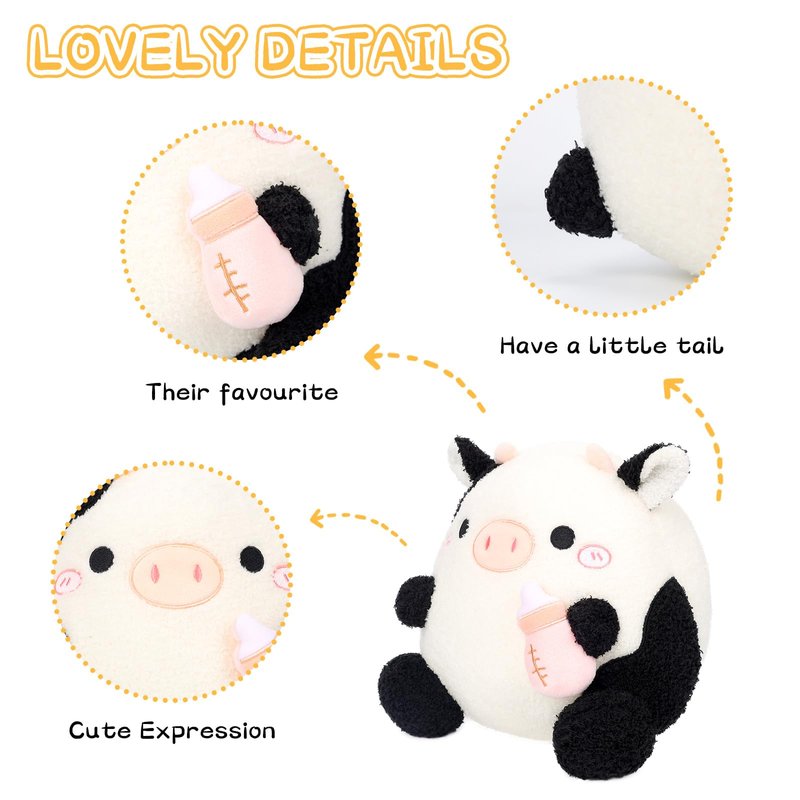 - 【Interesting Design】The cow plush toy has cuddle round body. The kawaii expression and its favouriate feeder make cattle plushie pillow more vivid and attractive.