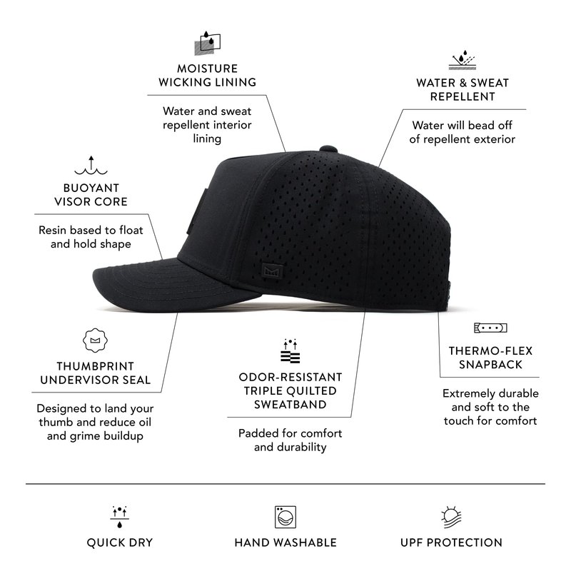 - PERFORMANCE SNAPBACK HAT: Exterior crown has hydrophobic crown panels, laser-perforated side & rear panels for breathability, and custom soft touch snapback closure. Visor has hydrophobic exterior, water capable core, and signature under visor seal