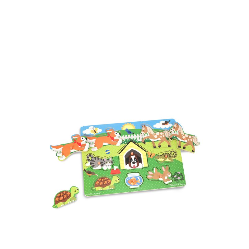 - EASY-TO-GRASP PEG PUZZLE: The Melissa & Doug Pets Wooden Peg Puzzle is a pets-themed puzzle that features bright colors and 8 illustrations of kids’ favorite pets.