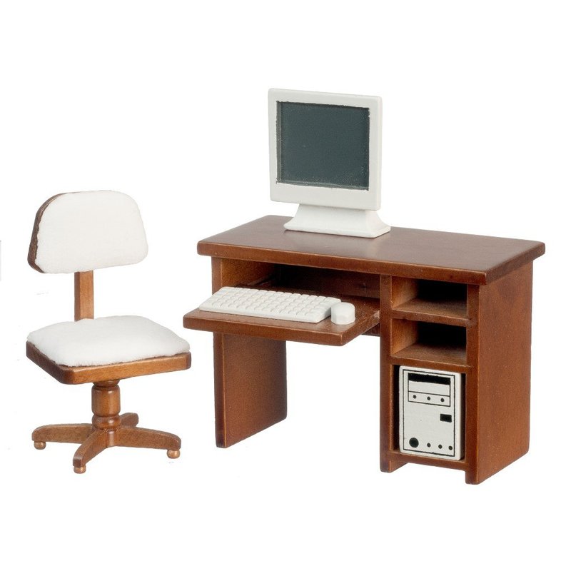 Melody Jane Dollhouse Walnut Computer Desk & Chair Miniature Study Office Furniture Set