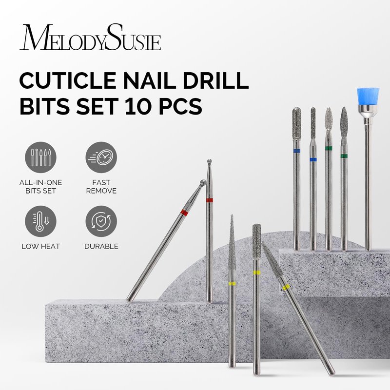 • All in One Nail Drill Bits Set: Made of premium diamond metal, this nail bits kit is strong enough for filing, drilling, and removing acrylic nails nature nails. 10Pcs different shapes and sizes bits design, meet your diversified needs, allowing you to prepare the nail bed, clean the cuticle area, shape and shorten the nail, smoothly remove on the surface, drill nail holes, and so on.