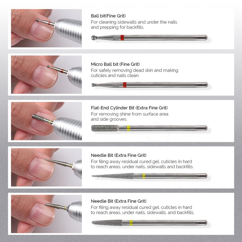 • Professional Diamond Nail Drill Bit: Comes with 9pcs fine grit bits, including flame bit/ nit bit/ safety bit/ small cylinder bit/ ball bit/ micro ball bit/ flat-end cylinder bit/ needle bits/ clean brush, this nail set works great for under nails cleaning, hard skin cleaning, cuticle removing. With a well-made case for storage and dust-proof, helping you figure out the desired bits quickly.