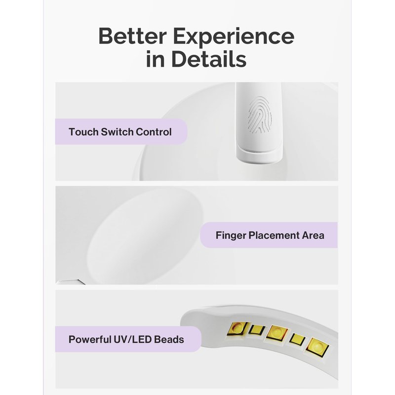 - 【UV Light Mode】UV Light Mode is widely compatible with all gel nails, providing flash curing for nail extensions, gel manicures, nail art design, stone application and etc. Recommended to place the fingernail below the light bar and turn the fingertips to achieve efficient, evenly and fast curing. UV Mode will switch into LED Mode after 60s automatically.