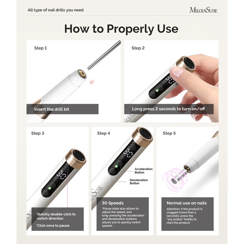 - 【Important Tips】This nail drill machine is recommended to be used with lighter nail bits such as cuticle clean bit/flame bit/ nit bit/ safety bit/ small cylinder bit/ ball bit/ micro ball bit/ flat-end cylinder bit/ needle bits, etc. MelodySusie always put the customer's experience and interests first, and also provide you with free 6-month after-sales service for product replacement.