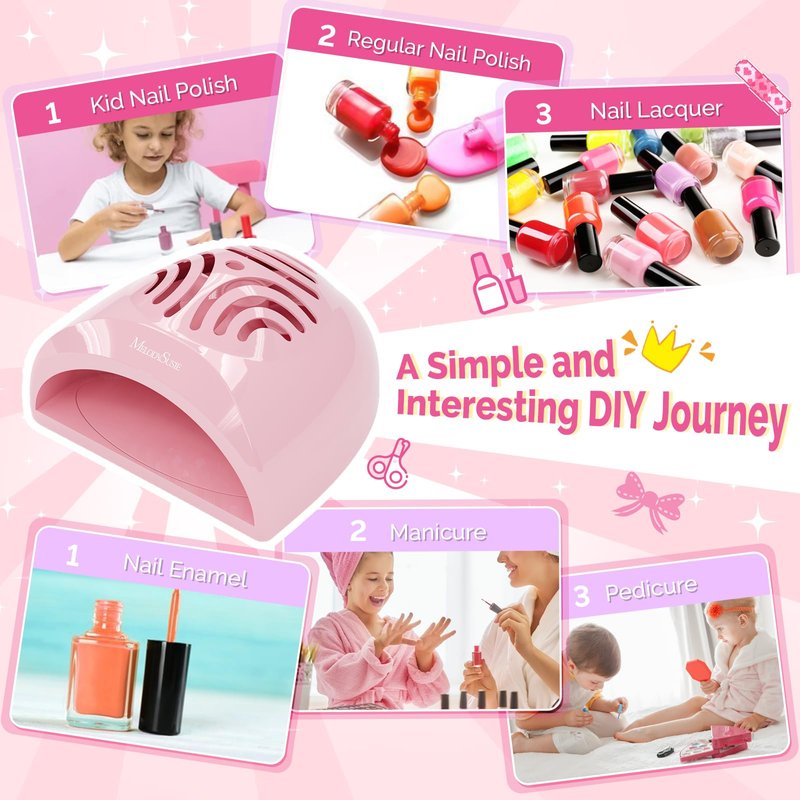 - ♥Mini & Portable Size: This mini size (5’’x5’’x3’’) nail lamp is very portable for nail salon, party, home and travel use. It's compatible with regular nail polishe, making it an excellent accessory for your child's nail art adventures.