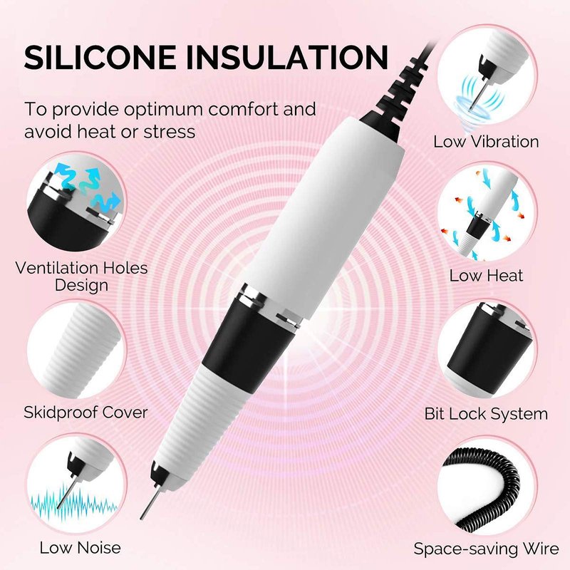 - 【Light Weight Handpiece】 Made of the special material, aluminum alloy. Ample ventilation holes are designed for dissipating the heat effectively. Do your nai[l smoothly and enjoy the feeling of low vibration. It will not let your hand be numb after long-term use. Pencil-shape and lightweight design are perfect for extended use. (works with all kinds of 3/32” shank bits).