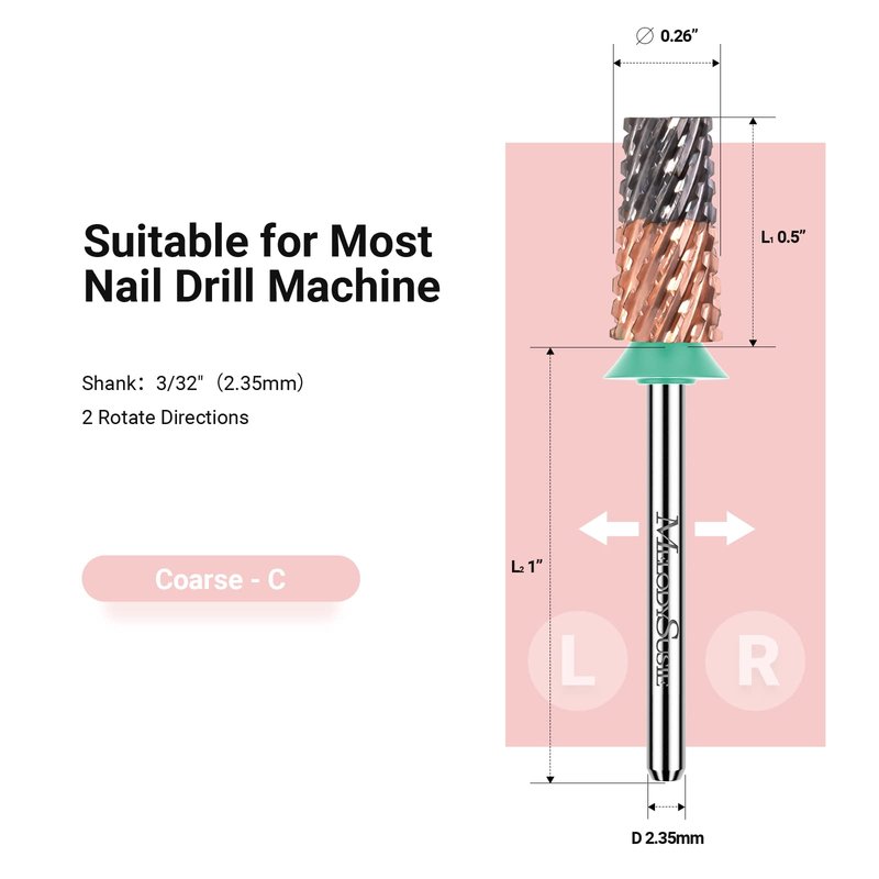 The large tapered barrel cross-cut carbide bits include a finer grit at the tip of the bit to avoid any damage on the cuticle and surrounding nail wall and a coarser grit towards the base of the bit for general surface work such as backfilling, filing, smoothing, and shaping. This carbide drill bit only fits 3/32" shanks. The drill bits also come in 4 different grit sizes (ranging from coarse to extra fine).
