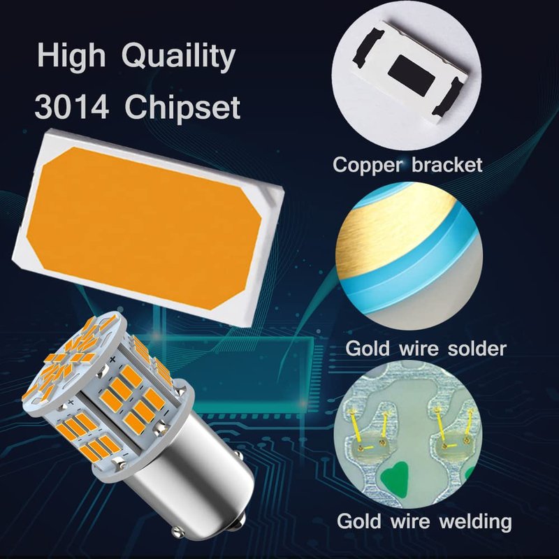 - Specification: 2pcs 1156 bulb with 54smd 3014 led chips, Length:1.4” 35.8mm, Diameter: 0.71” 18.2mm , Amber light,, Voltage: 12-24V, Wattage: 3w.