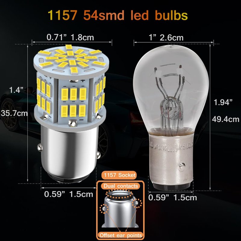 - Specification: 2pcs 1157 brake light bulbs with 54smd 3014 chips, Length:1.4” 35.8mm, Diameter: 0.71” 18.2mm , 6000K White light, 300lm per bulb, Voltage: 12V-24V, Wattage: 3w.