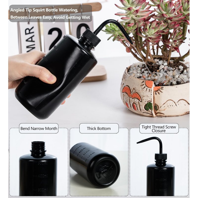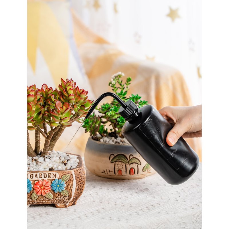 - Succulent Watering Bottle - Squeeze water bottles for plants Indoor watering bottle squeeze, Bending nozzle, narrow tip controls precise position and volume of watering. The plant squeeze bottle help irrigate directly the root of plants stem easily. Small water yield, not easy to wet plant leaves or stain your desktop. It’s also suitable for storing plant nutrient solution. Great for succulents, orchids, cactus and most small potted plants.