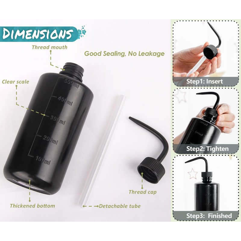High-quality Materials - Tattoo squeeze bottle is good flexibility, elasticity and avoid to impact, stress-cracking or high temperature. These tattoo bottles squeeze won’t deform in most solvents. Lightweight and portable. Easy to use, just squeeze the bottle. Wide Application - Wash bottles squeeze can be used as lab wash bottles to wash labware or tattoo water bottles to clean body tattoo. Also suitable for storing alcohol, plant nutrient solution, washing solutions and germicidal solutions needs or other liquids. Convenience tool for tattooist, lab stuff, barber ect. Perfect Watering Tool Plant Irrigation - Water squirt bottles for plants, bending nozzle design and narrow tip of the plant watering bottle allows for precise watering position and volume. The irrigation bottle can help you irrigate directly the root of plants stem very easily and accurately, and small water yield, not easy to wet the plant leaf center or dirty your desktop. Great for succulents, orchids, cactus, small potted plants and etc. Smooth Water Flow & Good Seal – plant water squeeze bottle out water smoothly and easily. Also very easy to grip and squeeze. You can control the watering direction very conveniently, great watering and washing tools. Good seal, polypropylene screw closure with its angled stem and draw tube molded in one piece for leakproof applications. Visible Digital Scale - The lash water bottle squeezer is marked with a digital scale. You can easily measure how much liquid to add to the wash bottles. It will help you better control how much liquid is released, so you will not waste. This is also very friendly for delicate small plants which probably yellowing for too much watering.