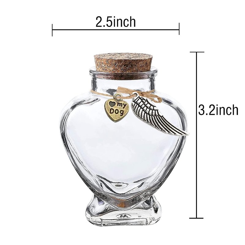 - Glass bottle with cork top, metal charms, and a hemp string bow. Perfect for a memorial of your beloved pet
