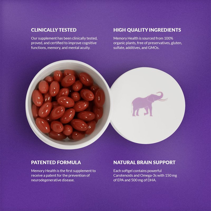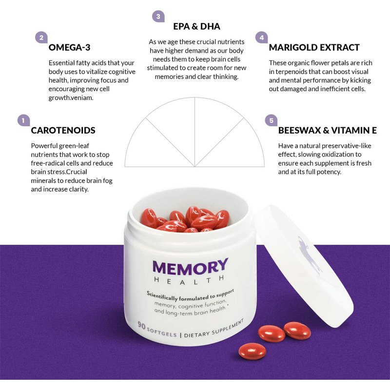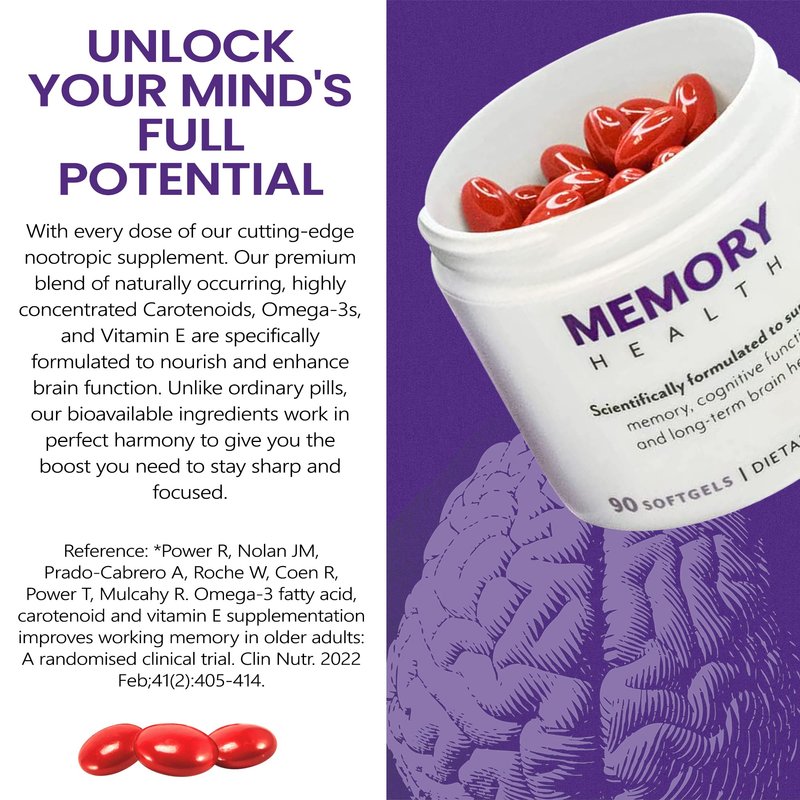 Unlock peak cognitive performance with Memory Health, the advanced brain focus and memory supplement that transcends traditional cognitive support. In a world where brain health is paramount, our scientifically-backed formula, validated by studies like Macleod and Appleton's research on neurological disorders, empowers both healthy and vulnerable minds alike. Crafted with precision, each softgel boasts a potent blend of naturally occurring Carotenoids, Omega-3s, and Vitamin E, meticulously concentrated for optimal brain absorption. This isn't just a nootropic supplement; it's a daily defense against oxidative stress and free radicals, championed by the findings of Power et al.'s clinical trial. In as little as three months, three capsules a day reveal unrivaled effectiveness, a testament to the synergistic power of carotenoids and omega-3 fatty acids, as validated by Nolan et al.'s Alzheimer's prevention study. Trust in Memory Health's patented formula, a result of over two decades of scientific evidence emphasizing nutrition as the key to brain health, tested rigorously in double-blind, placebo-controlled clinical trials on both healthy and diseased brains. Choose not just a supplement but a trusted partner in cognitive wellness – choose Memory Health.