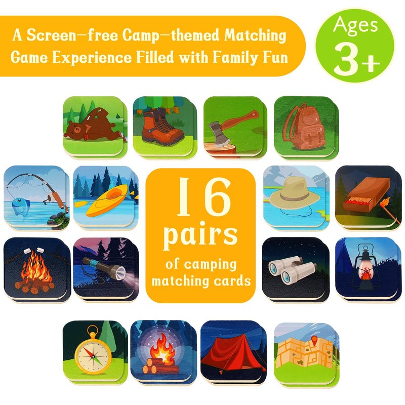 - 【MATCHING CARD SET INCLUDES】 The matching memory game includes 16 matching card pairs (32 pieces)and an instruction manual.Designed with the theme of camping that children like, and printed with vibrant patterns, it can fully allow children to exert their enthusiasm for playing games.