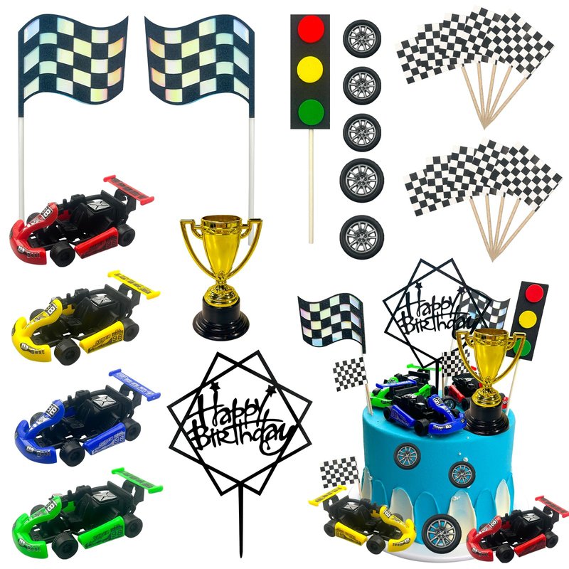 - 【Racing Car Birthday Cake Decoration Set】:Package Comes comes with 23pcs racing car cake decorations include 4pcs racing car cake topper measured 2.13 x 3.66 x 0.98inch, 4pcs wheels, 10pcs Checkered racing flag Cupcake Toppers, 2pcs big flag cake toppers, 1pc black happy birthday cake topper, 1pc traffic light cake topper, 1 gold trophy cake topper. Enough for your car themed party decorations.