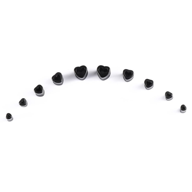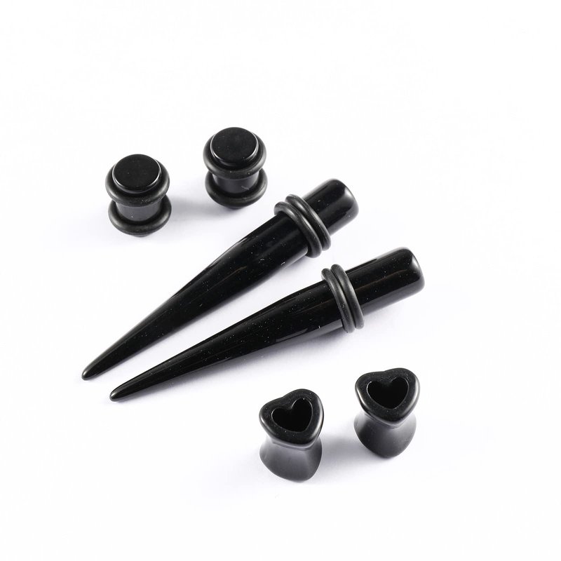 - 【SIZE AND COLORS】 - Acrylic plugs gauges and tapers for ears with double o-rings: 14G (1.6mm), 12G (2mm), 10G (2.4mm), 8G (3.2mm), 6G (4mm), 4G (5mm), 2G (6mm), 0G (8mm), 00G (10mm). heart ear plug: 6G (4mm), 4G (5mm), 2G (6mm), 0G (8mm), 00G (10mm). Black color.
