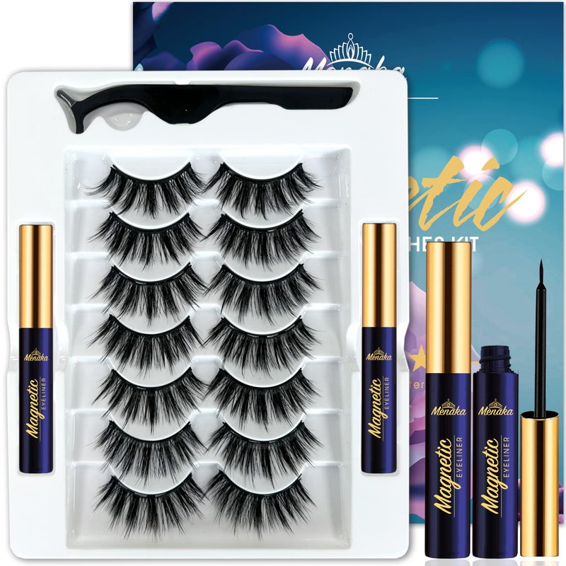 Menaka 3D Magnetic Eyelashes -Magnetic Lashes with Eyeliner Kit - Upgraded,Natural Look,Long Lasting,Reusable,With Applicator - 7 Pairs Easy to Apply (2 Tube of Liner)