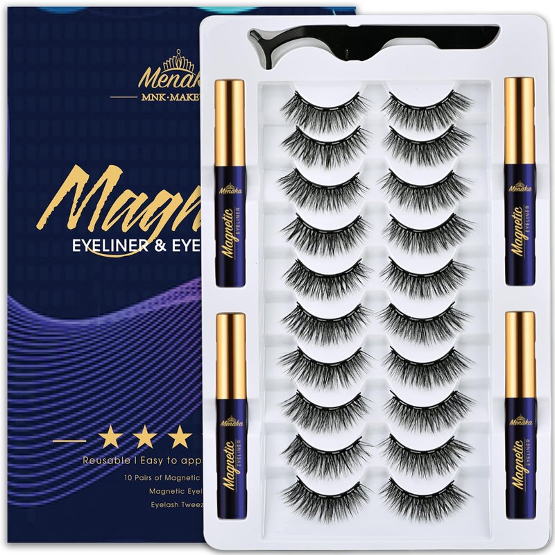 Menaka Magnetic Eyelashes 10 Pairs Reusable Magnetic Lashes Natural Looking with Applicator - 4 Tubes of Magnetic Eyeliner with Magnet False Lashes, Updated Strongest,Reusable and Cruelty-Free