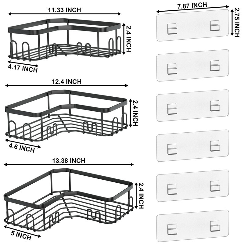 - Package Contents : 3 x shower organizer corner, Large:9.84 × 9.84 × 2.4 inches, Middle:9.06 × 9.06 × 2.4 inches,Small:8.27 × 8.27 × 2.4 inches.6 x adhesive, 18 x hook. (NOTE: If you meet any problems, please contact us, our customer service will solve your problems.)